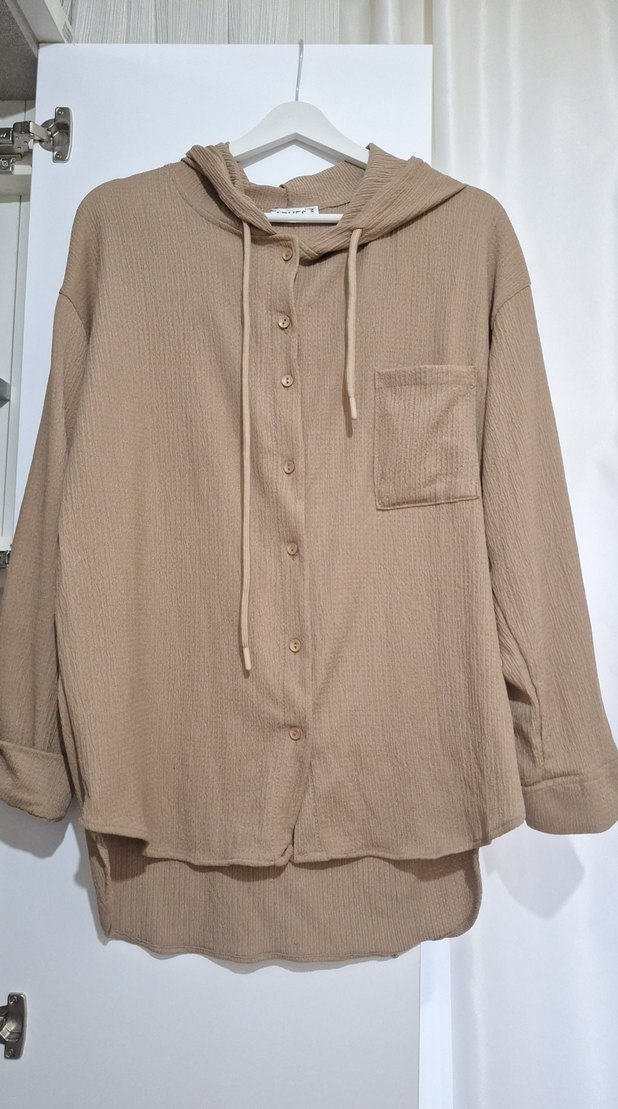 Bej renkte, kapüşonlu ve düğmeli keten gömlek. Uzun kollu, rahat kesim ve göğüs cebine sahip, günlük kullanıma uygun.