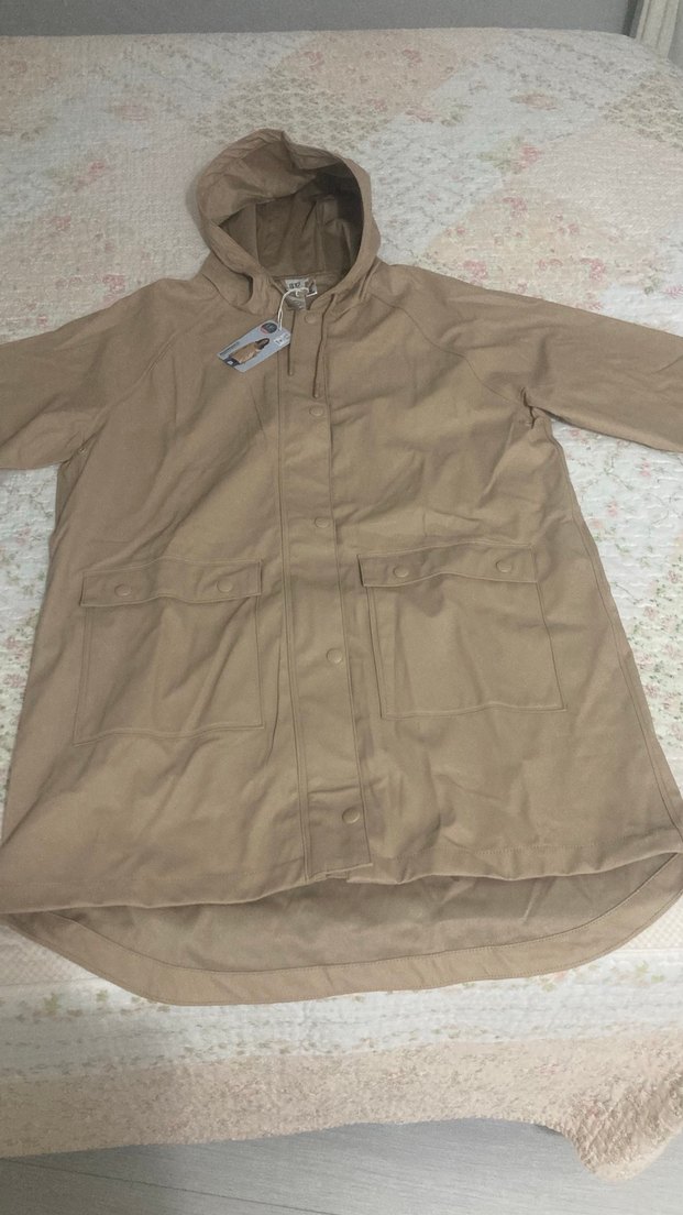 Bej renkte, midi boy, bol kesim, uzun kollu kadın yağmurluk. Düğmeli, kapüşonlu ve cepli, sentetik kumaştan günlük rahat kullanım için uygun. ️