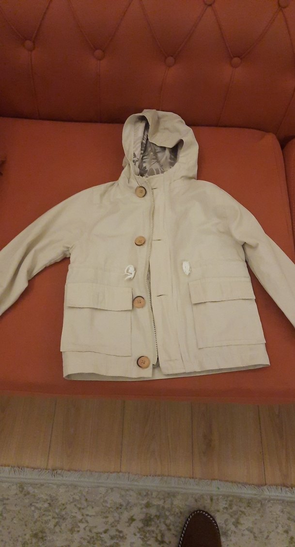 Bej renkli, kapüşonlu ve düğmeli erkek çocuk kabanı. Bol kesim ve yumuşak kumaş kullanılmış, cepleri geniş. Sokak stiline uygun.