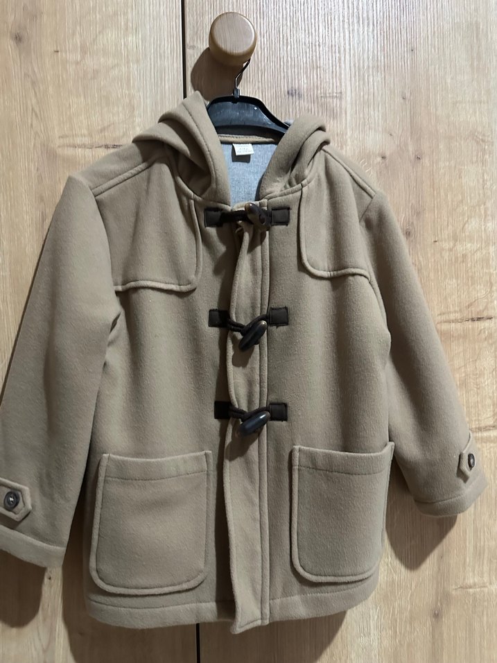 Bej kapüşonlu erkek çocuk kaban, düğmeli ve kesik yaka detaylı. Rahat kalıp ve sokak modasına uygun, yumuşak ve sıcak kumaştan yapılmıştır.