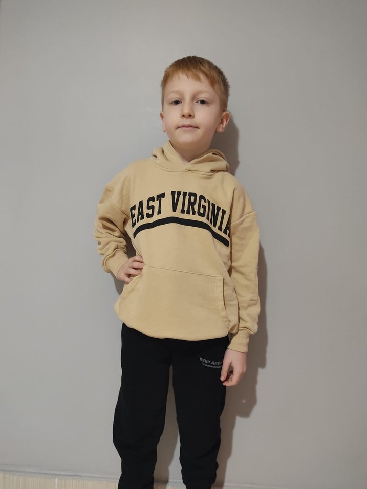 5-6 yaş aralığındadır. Bej renkli, baskılı East Virginia tasarımlı, rahat kesim ve bisiklet yaka kapüşonlu erkek çocuk sweatshirtü.