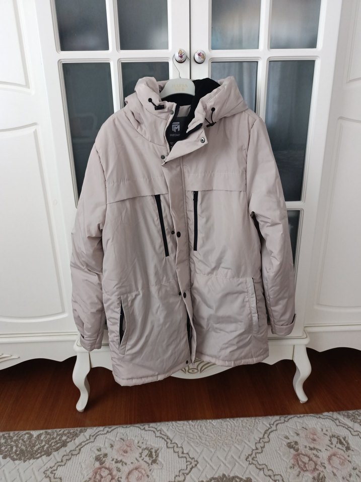 Bej renkli, kapüşonlu ve fermuarlı erkek mont. Bol kesim, uzun kollu ve yumuşak, sıcak kumaştan üretilmiştir. ️