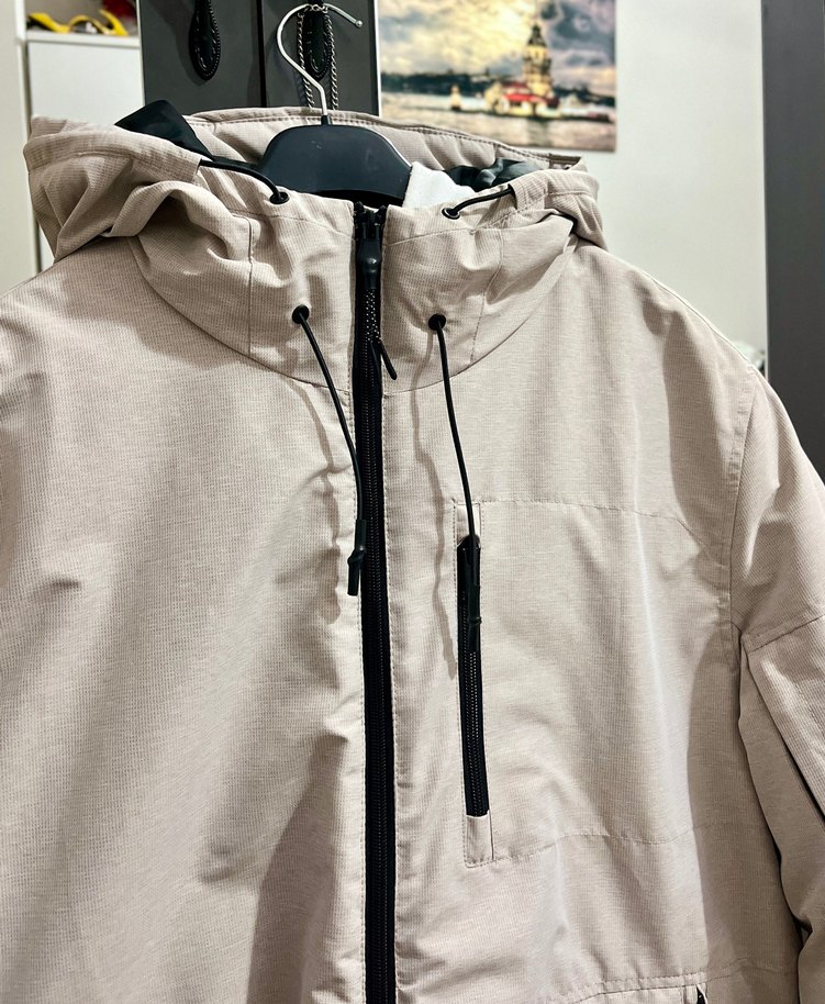 Bej ve gri tonlarında, kapüşonlu ve fermuarlı, sentetik kumaştan yapılmış, bol kesim ve bisiklet yaka uzun kollu erkek spor mont.
