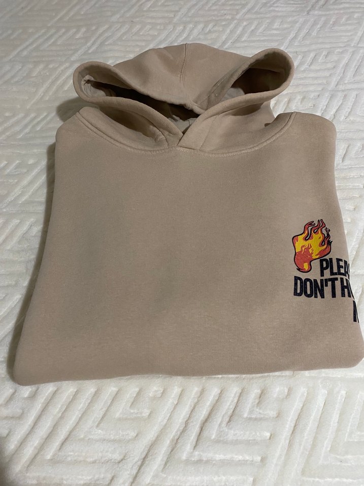 Yumuşak ve sıcak kumaştan yapılmış, bej renkli kapüşonlu ve baskılı alev desenli, uzun kollu, normal boy kesime sahip sweatshirt. İki kol arası 64 cm boy 70 cm nokta hatası vardır