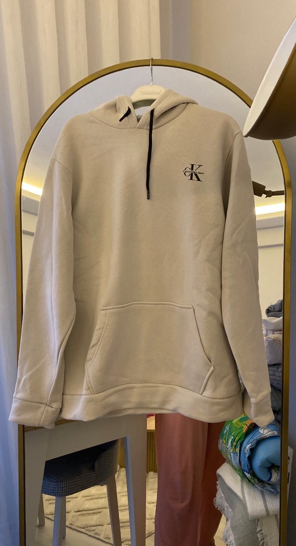 Uzun kollu, kapüşonlu ve bol kesim bej sweatshirt, küçük baskılı logo detaylı. Rahat ve yumuşak kumaş, günlük kullanım için uygun.
