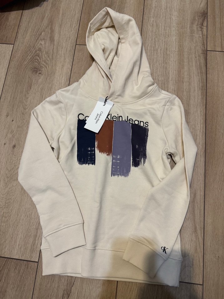 Bej kapüşonlu, uzun kollu erkek sweatshirtü. Yumuşak kumaştan, baskılı desenli ve Calvin Klein Jeans logosu ile rahat bir sokak stili sunar.
