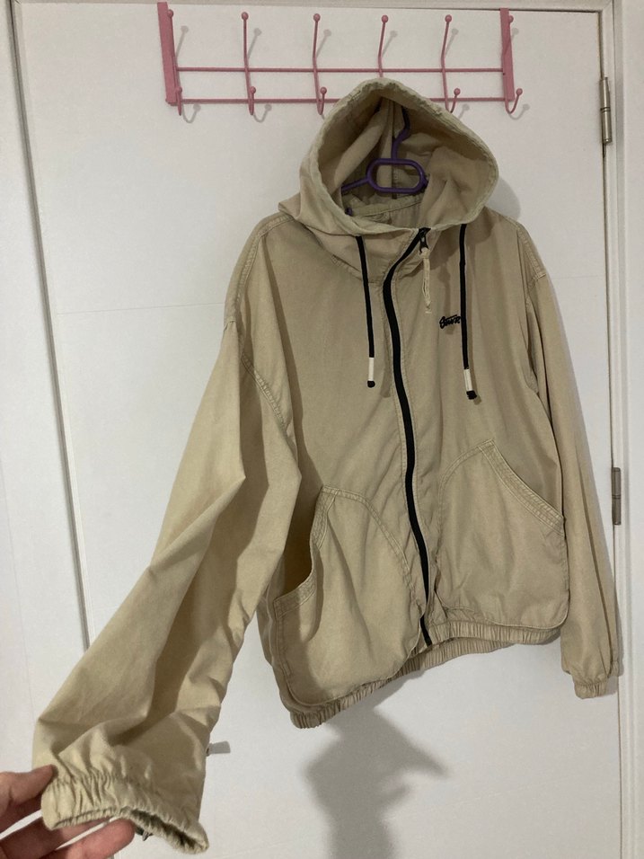 Bej renkli, kapüşonlu ve fermuarlı, yüksek yakalı, bol kesim erkek ceket. Keten kumaştan, günlük rahat kullanım için uygundur.