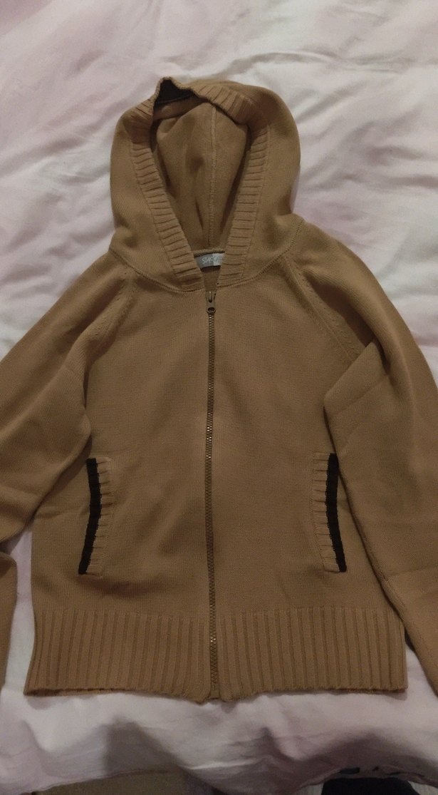 Bej renkli, kapüşonlu hırka fermuarlı önü ve uzun, vücuda oturan kolları ile dikkat çeker. Yumuşak kumaştan, normal midi boyda, desensiz tasarımı günlük rahat kullanıma uygundur.