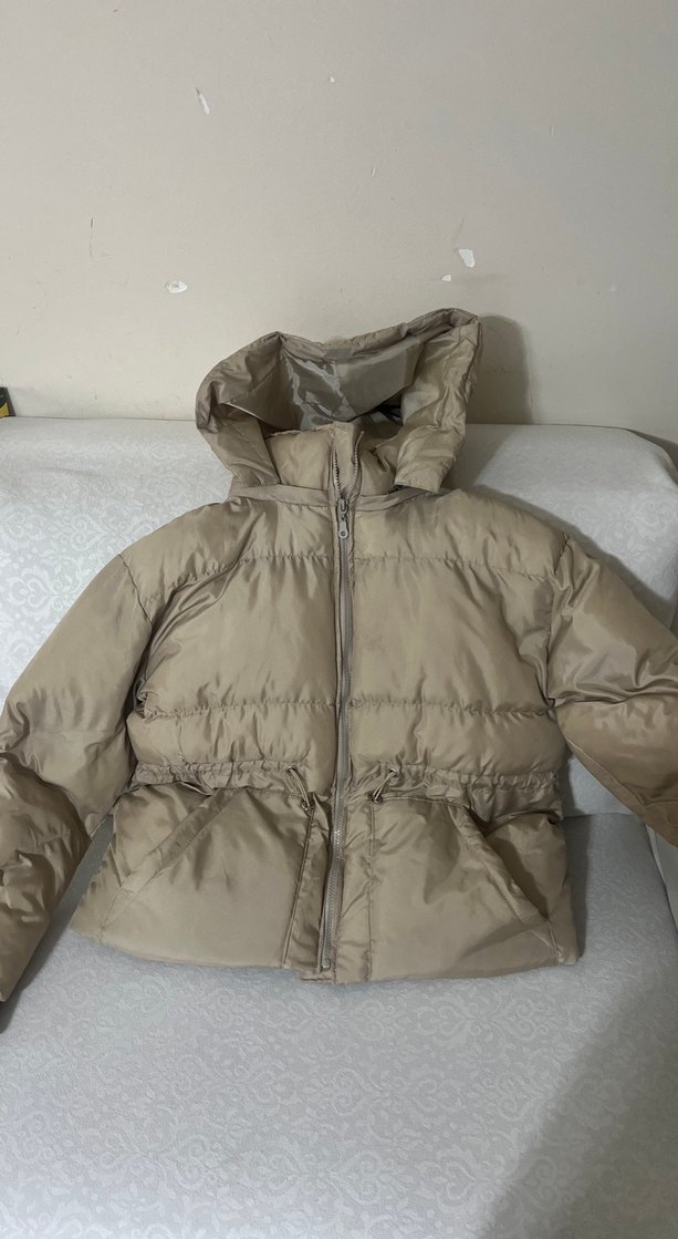 Bej renk, fermuarlı, yüksek yakalı, sentetik kumaştan yapılmış kadın kışlık mont. Sokak stiline uygun, normal boyda ve askılı kollu, günlük kullanıma uygundur. ❄️ sadece bir kez giyildi bej rengi