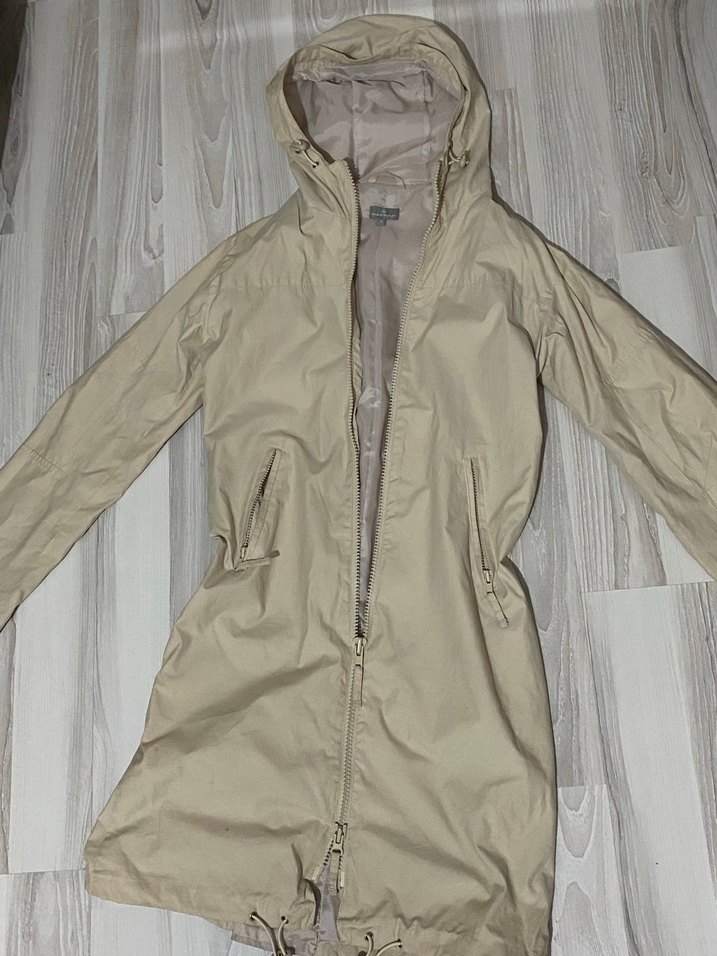 Bej kapüşonlu, fermuarlı kadın yağmurluk. Gevşek kesim ve uzun kollu, sentetik kumaştan, dış mekan ve sokak stili için uygun. önünde hafif lekesi var fotoğrafa ekledim başka sorunu yok orijinal Naf Naf