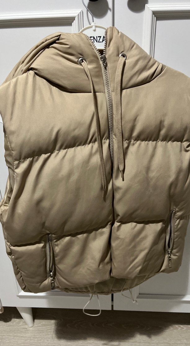 Yüksek yakalı, fermuarlı cepleri olan bej renkli kolsuz yelek. Yumuşak sentetik kumaştan, günlük rahat kullanıma uygun dar kesim ve normal boyda.
