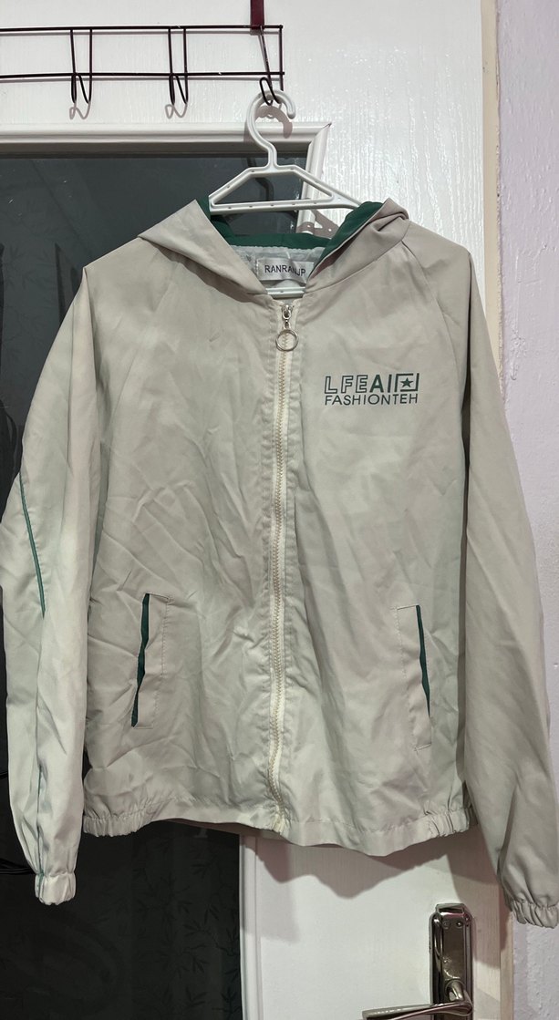Bej renkli, kapüşonlu ve fermuarlı bu ceket, sentetik kumaştan üretilmiştir. Rahat kesimi ve baskılı desenleriyle günlük kullanıma uygundur. Ön cepleri ve gri detaylar bulunur. 'SHIANT' markası görünür.