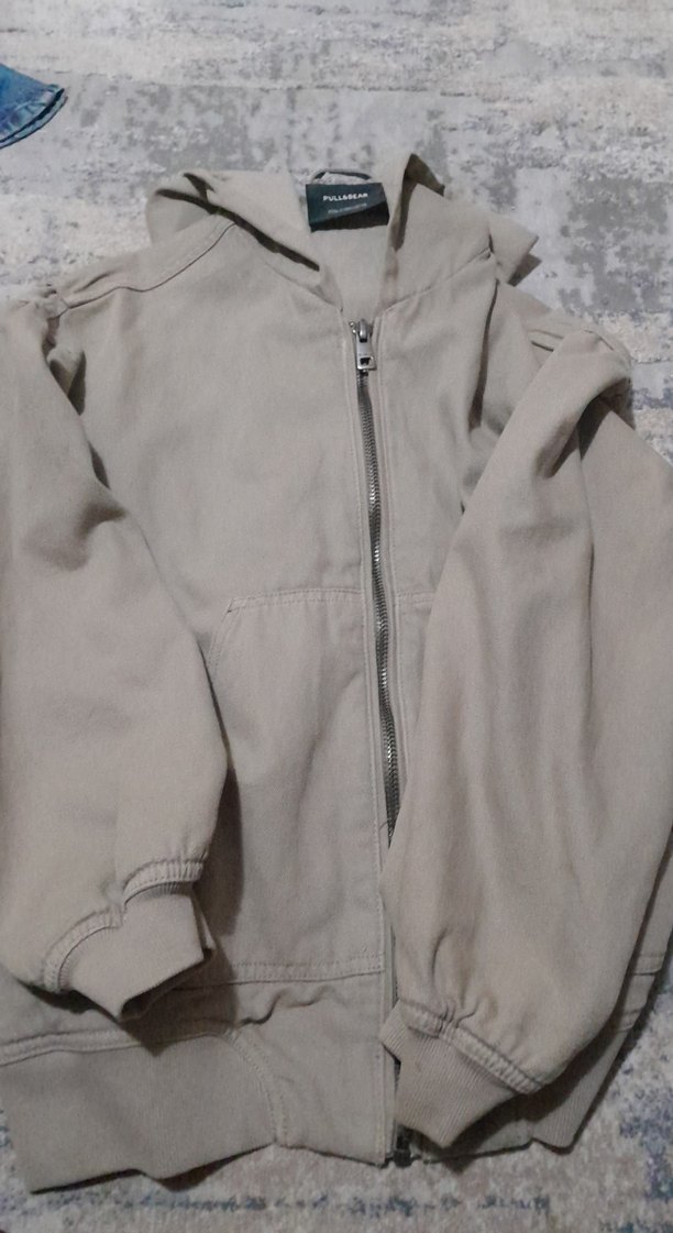 Fermuarlı, kapüşonlu ve uzun kollu kadın ceket. Yumuşak keten kumaştan, bol kesim ve midi boyda, bej renkte sade tasarım.