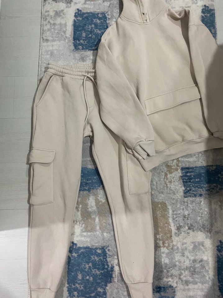 Bej kapüşonlu eşofman takımı, bol kesim ve yumuşak polar kumaş ile rahat ve şık bir görünüm sunar. Pratik ceplere sahiptir.