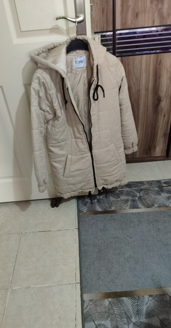 Bej renkli, kapüşonlu kadın kış ceketi, fermuarlı ve uzun kolludur. Yumuşak keten kumaştan, bol kesim ve midi boydadır.