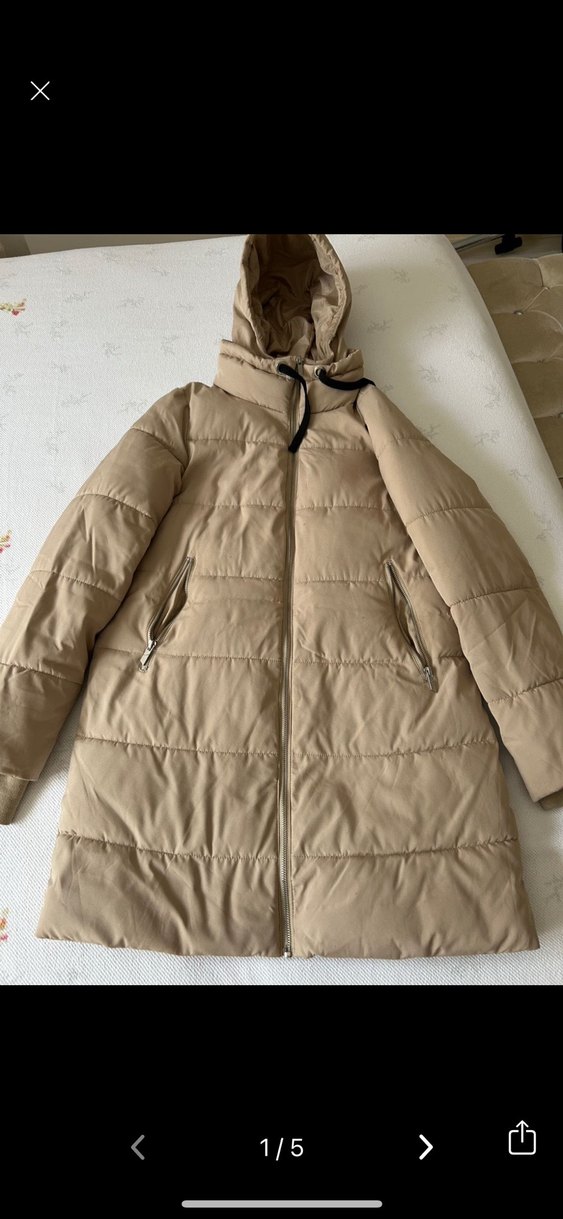 Bej renkli, kapüşonlu ve fermuarlı ceplere sahip, yumuşak kumaştan yapılmış kadın kışlık mont. Normal midi boyda, yakası çentikli ve rahat sokak tarzı için uygun.