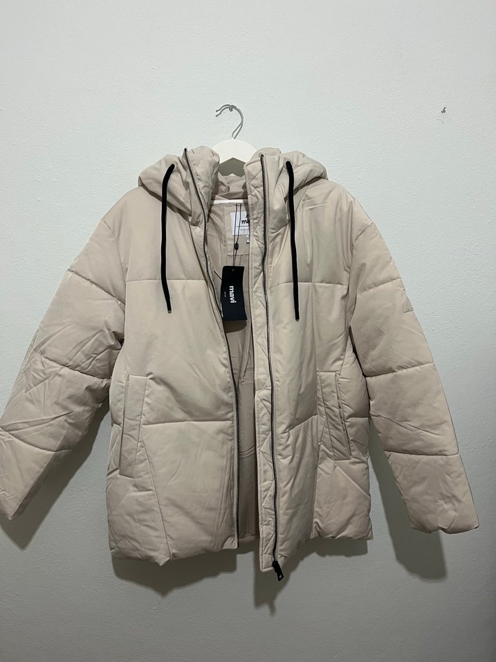 Bej renkli, kapüşonlu kadın kışlık mont, fermuarlı ve uzun kolludur. Rahat kesimi ve midi boyuyla günlük kullanıma uygundur. Etiketi üzerinde