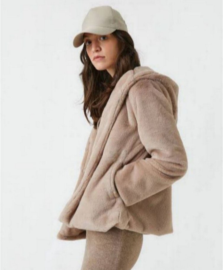 Bej Kapüşonlu Kadın Kışlık Peluş Ceket