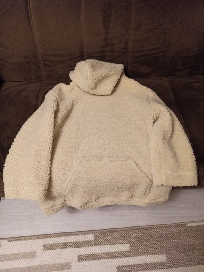Yumuşak peluş dokulu, kapüşonlu ve uzun kollu bej kadın ceket. Rahat kalıbı günlük kullanım için uygundur. Çok az giyilmiştir. Çok güzel ısıtır. Özel dikimdir.