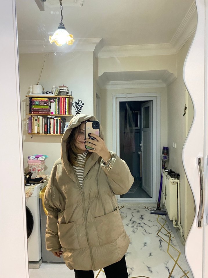 Bej renkli, kapüşonlu, uzun kollu ve bol kesim midi uzunluğunda kadın kışlık mont. Puff detaylı ve yumuşak, sıcak tutan kumaşa sahip.