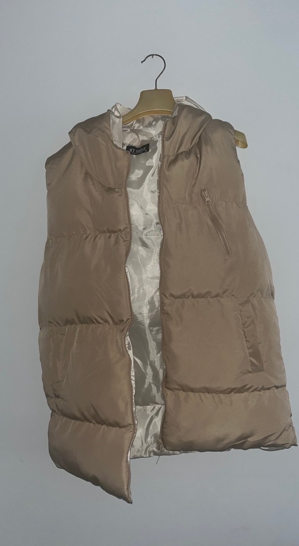Yüksek yakalı, fermuarlı, bej renkte, sentetik kumaştan yapılmış, rahat kesimli kolsuz şişme kadın yelek. Şehir stiline uygun ve gündelik kullanıma ideal. Arka tarafındaki küçük leke dışında hiçbir sıkıntısı yok.