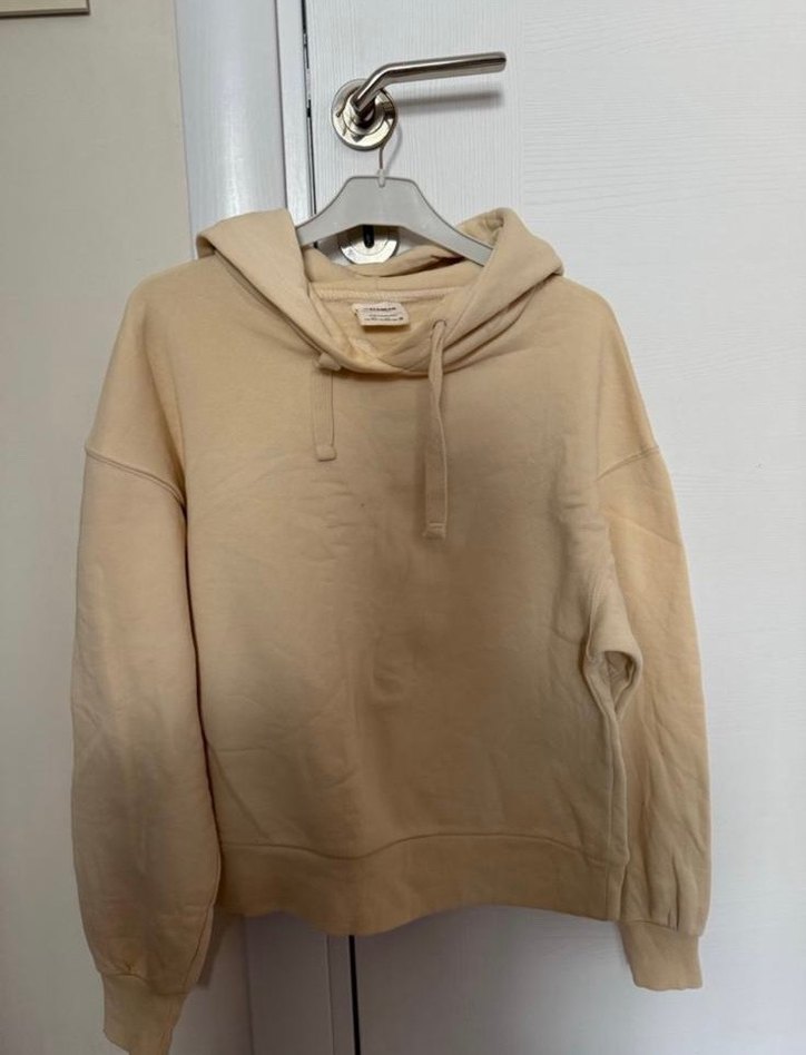 Bej renkte, kapüşonlu ve uzun kollu kadın sweatshirtü, rahat kesimi ve yumuşak dokusuyla günlük kullanıma uygundur. Pastel tonları ve sade tasarımıyla sokak modasına uyum sağlar.
