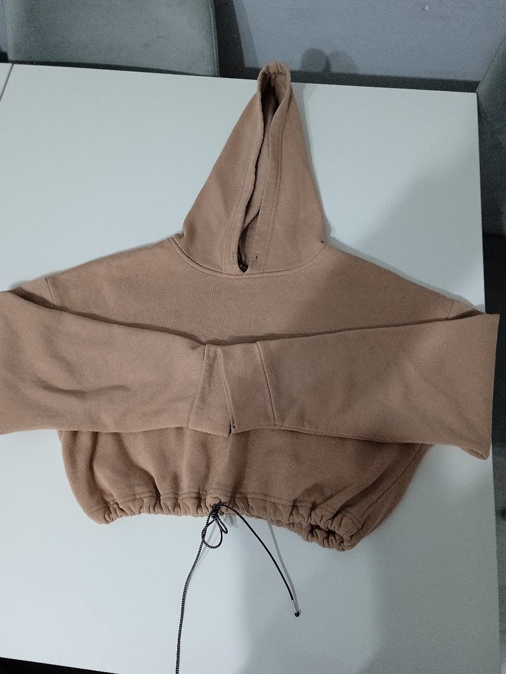 Yumuşak ve sıcak kumaştan yapılmış, bol kesim bej kapüşonlu sweatshirt, uzun kollu ve ayarlanabilir ip detaylı, gündelik sokak stili için uygun.
