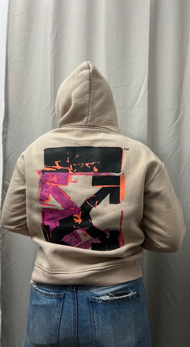 Bej kapüşonlu, uzun kollu, rahat kesimli, baskılı ve yumuşak kumaşlı sweatshirt.