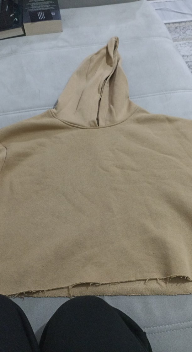 Bej kapüşonlu, yuvarlak yaka ve uzun kollu kadın sweatshirt. Rahat kesim ve yumuşak kumaşa sahip, desen içermeyen ve kesik uç detaylı, günlük kullanım için uygun.