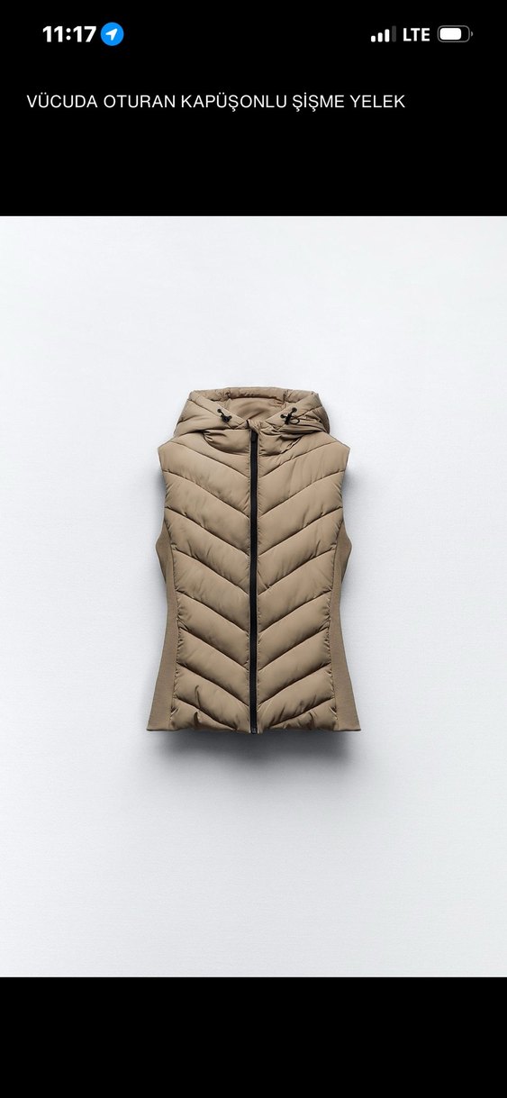 Yüksek yakalı, kemerli ve kapüşonlu bej yelek. Sentetik kumaştan, belden oturan kesimiyle günlük kullanıma uygundur.
