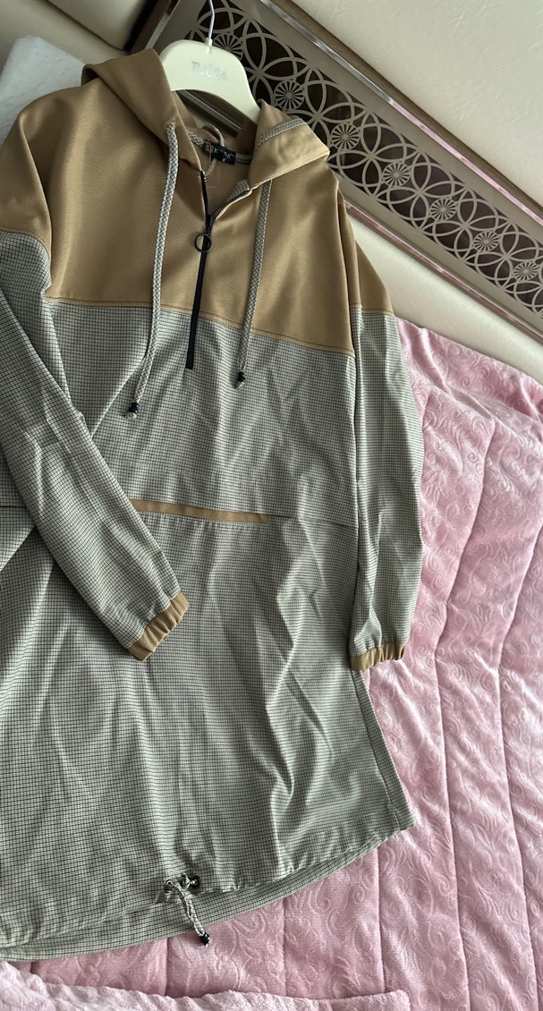 Kadın yağmurluğu kapüşonlu, uzun kollu ve bol kesimdir. Fermuarlı, kısa boyda, bej renkte ve ince desenlidir, sokak stiline uygundur. ️