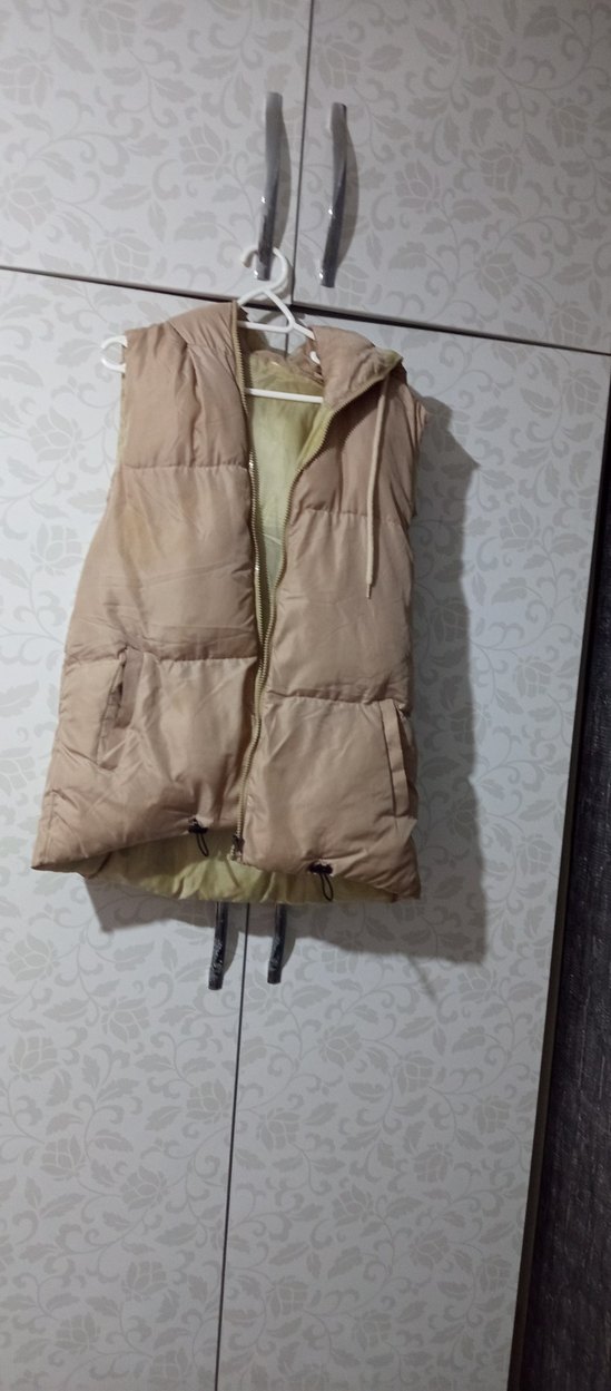 Bej renkte, kapüşonlu ve kısa kesim kadın yelek. Fermuarlı ve cepli, hafif sentetik kumaştan, rahat ve şık bir günlük sokak stili ürünü.