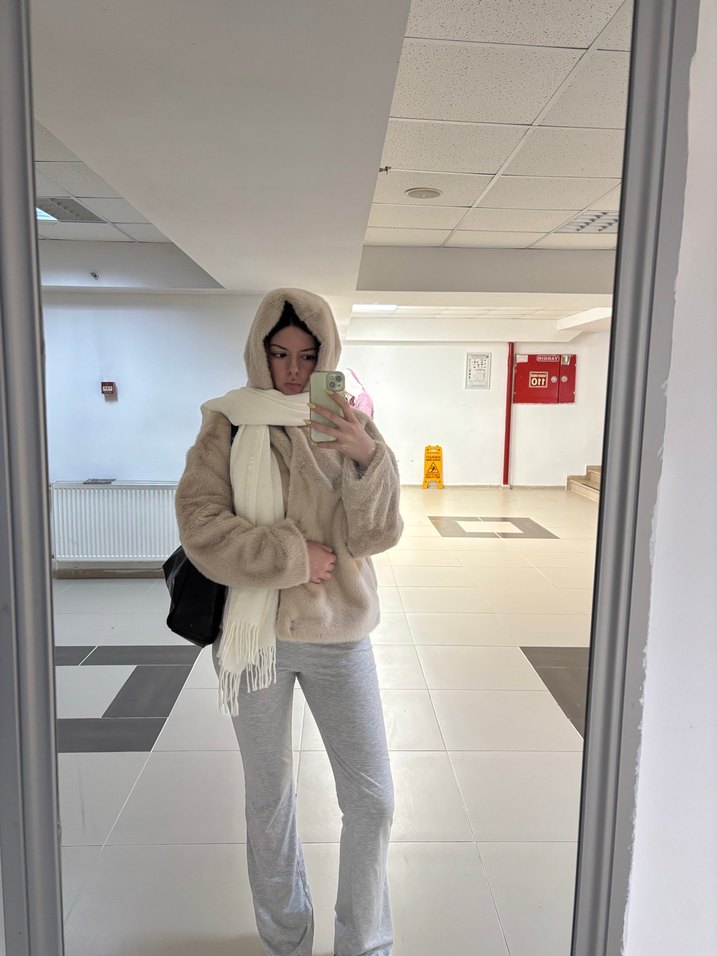Bej kapüşonlu, midi boy, bol kesim kadın kışlık ceket. Yumuşak ve sıcak kumaştan, hiçbir deformesi yok sadece kapüşon kısmında belli belirsiz fondöten lekesi var