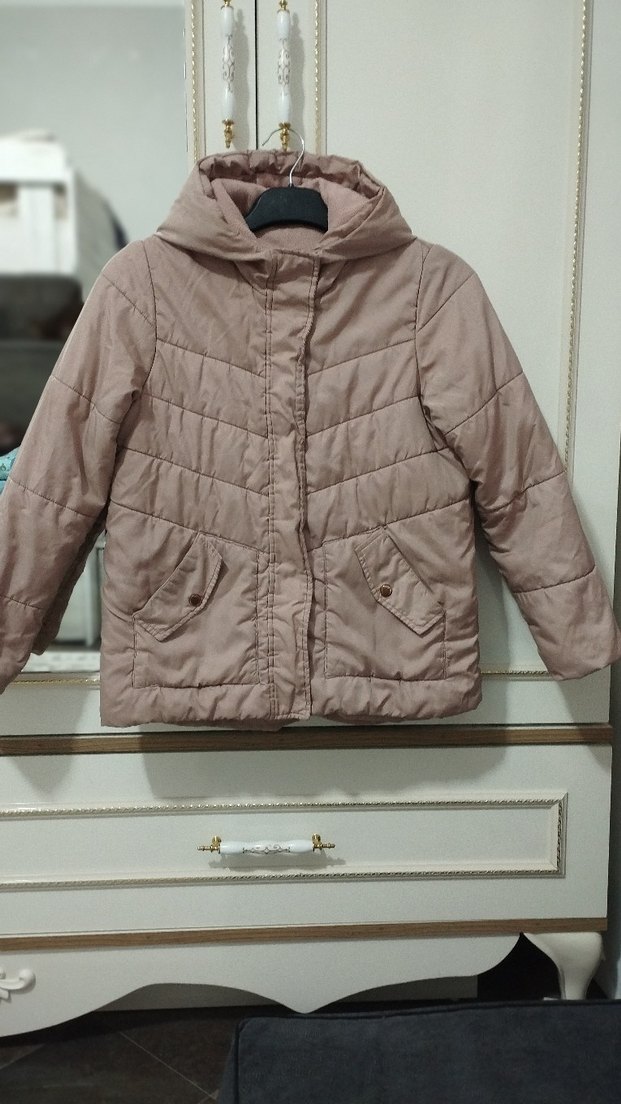 Bej renkli, düğmeli ve kapüşonlu kız çocuk montu. Yumuşak ve sıcak kumaştan, notlu yaka ve ceplidir. Günlük sokak stili için uygun.