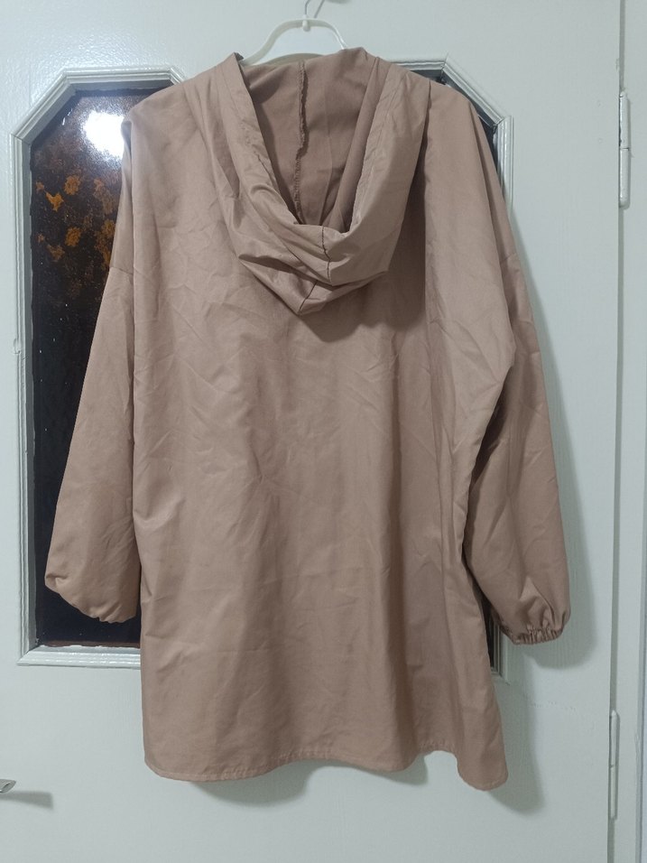 Bej renk, kapüşonlu ve uzun kollu, keten kumaştan midi boyda bol kesim yağmurluk. Drapeli tasarımıyla sokak stiline uygun.