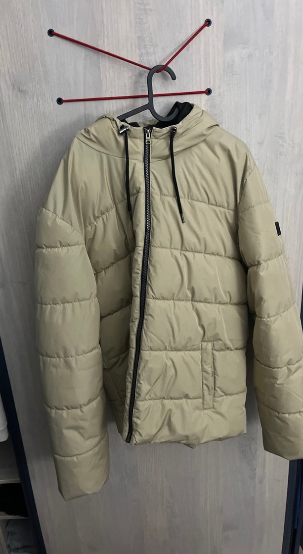 Bej renkli, uzun kollu, fermuarlı kadın kışlık mont. Yumuşak ve sıcak kumaştan, kapüşonlu, midi boyda ve rahat kesim. fazla giymedim biraz bol sadece