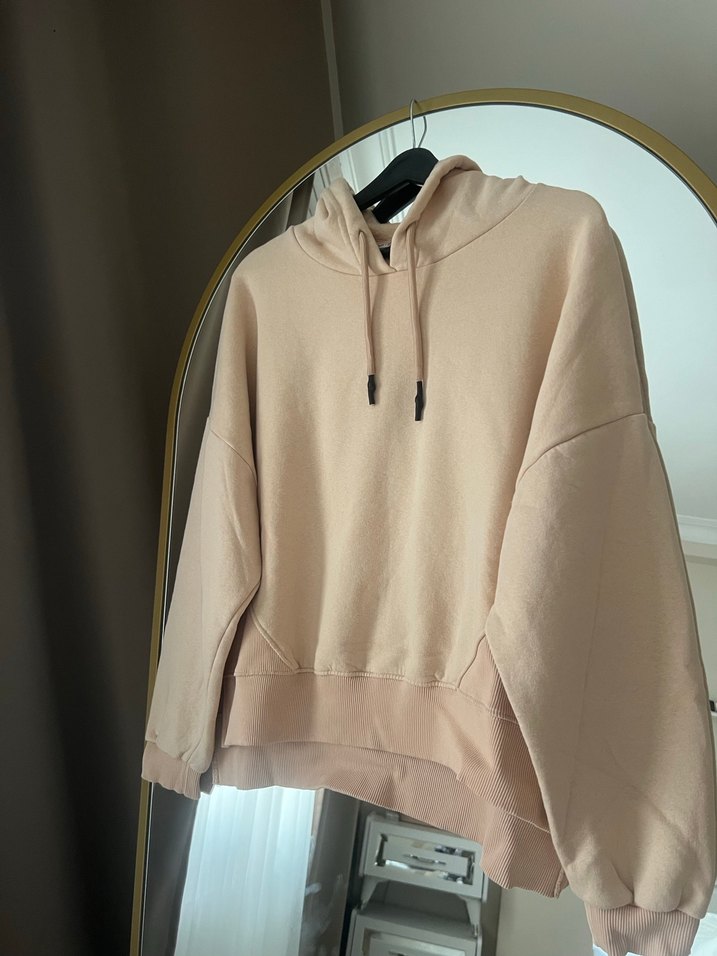 Bej renkte, kapüşonlu, uzun kollu ve bol kesim kadın sweatshirt. Yumuşak ve sıcak kumaştan yapılmıştır. Günlük kullanıma uygun, zahmetsiz şıklık sunar.