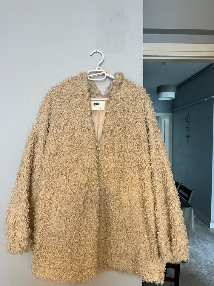 Bej renkte, kapüşonlu, uzun kollu ve midi boyda kadın ceket. Yumuşak, sıcak peluş kumaştan, bol kesim ve kürk detaylıdır. Rahat ve gündelik kullanıma uygundur.