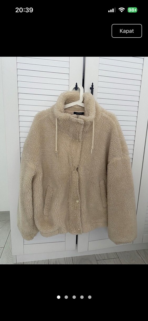 Bej renkte, kapüşonlu ve uzun kollu, gevşek kesim peluş kumaştan yapılmış kadın ceket. Günlük sokak stiline uygun, rahat ve sıcak tutar. Düğmesinin orda minik bir sorun vardır ama Bellı bıle olmuyor