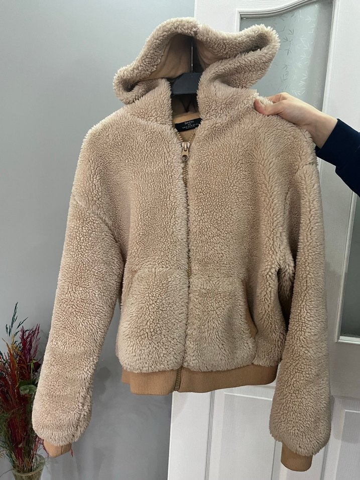 Bej renk, kapüşonlu ve uzun kollu kadın ceket, yumuşak ve sıcak peluş kumaştan yapılmıştır. Salaş kesimi ve bisiklet yaka detayıyla günlük kullanıma uygundur.