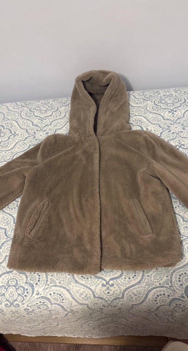 Bej renkte, kapüşonlu ve kürk detaylı kadın ceketi. Yumuşak ve sıcak kumaştan üretilmiş, bol kesim ve uzun kolludur.
