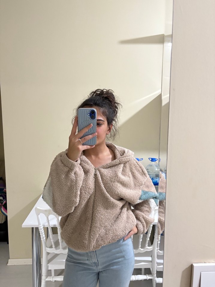 Bej renkli, kapüşonlu ve uzun kollu bu ceket, orta boy ve bol kesime sahiptir. Yumuşak ve sıcak kumaştan üretilmiş olup günlük kullanıma uygundur. çok giydim o yuzden dısarda giyilmez ama evde giyime uygun. herhangi bi defosu yok sadece eskidi. isteyen icin detay atarım