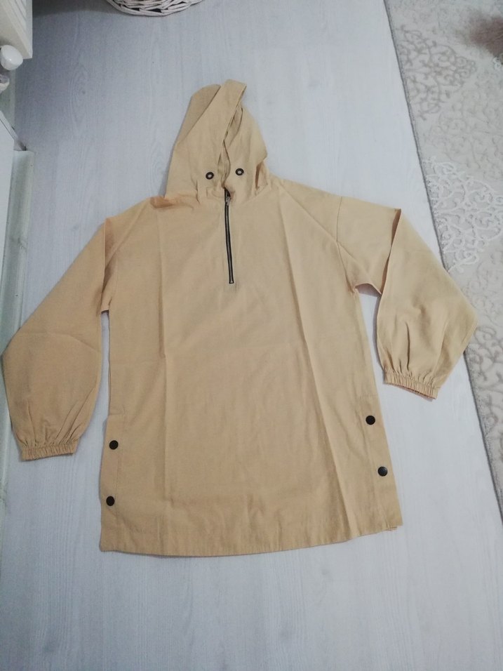 Bej renkte, kapüşonlu ve düğmeli uzun kollu, rahat kesim kadın tunik. Midi boyda ve yumuşak pamuklu kumaştan üretilmiştir.