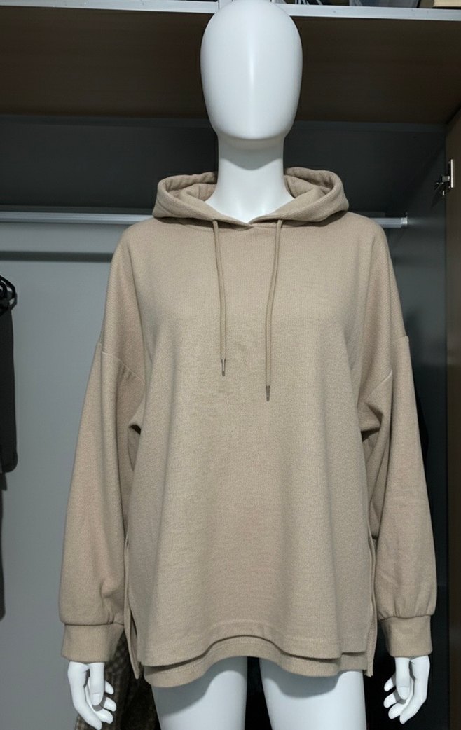 Bej kapüşonlu sweatshirt, uzun kollu ve rahat kesimdir. Yumuşak ve sıcak kumaştan üretilmiştir, günlük kullanım için uygundur.