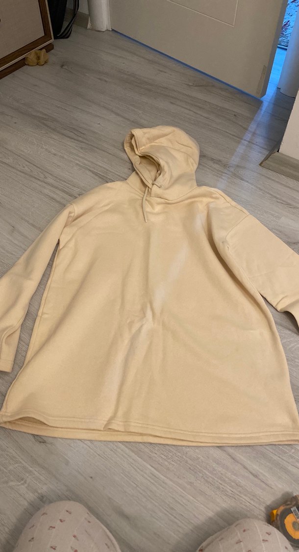 Bej renk, kapüşonlu ve uzun kollu, yumuşak ve sıcak kumaştan salaş kesim kadın sweatshirt. 70 cm