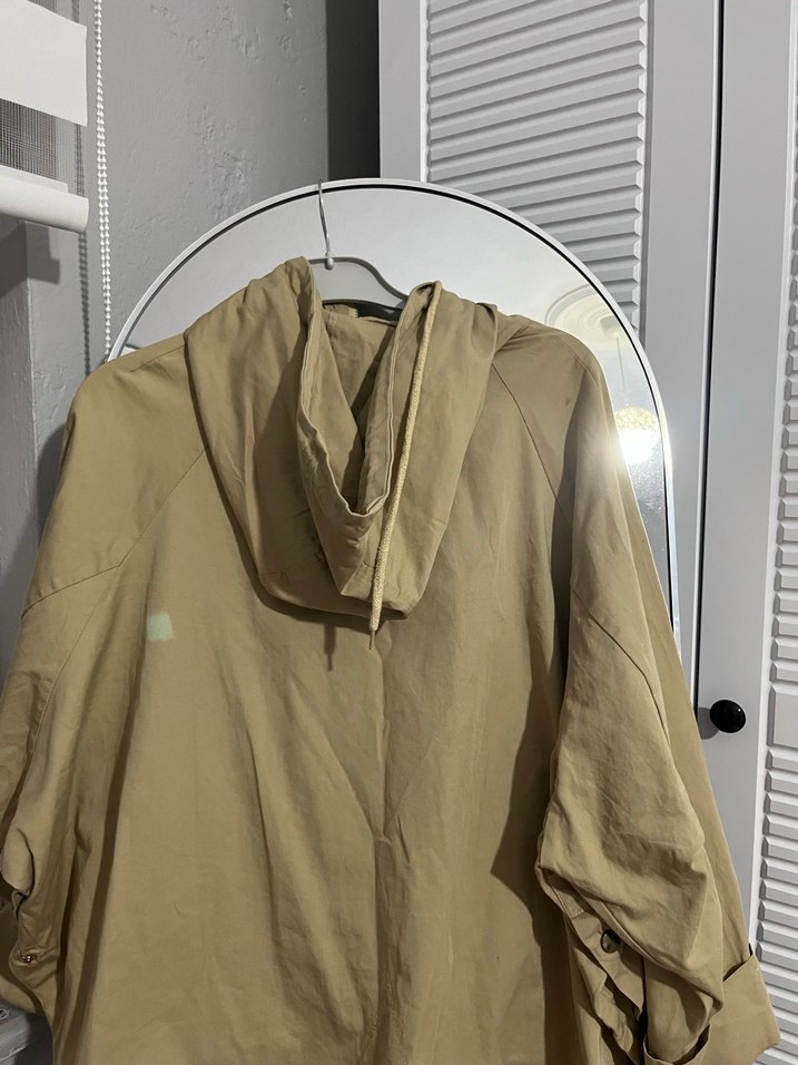 Bej renkte, kapüşonlu ve salaş kesimli kadın trençkot. Keten kumaştan, uzun kollu ve midi boyda. Sokak stiline uygun, desen içermeyen modern tasarım. ☔