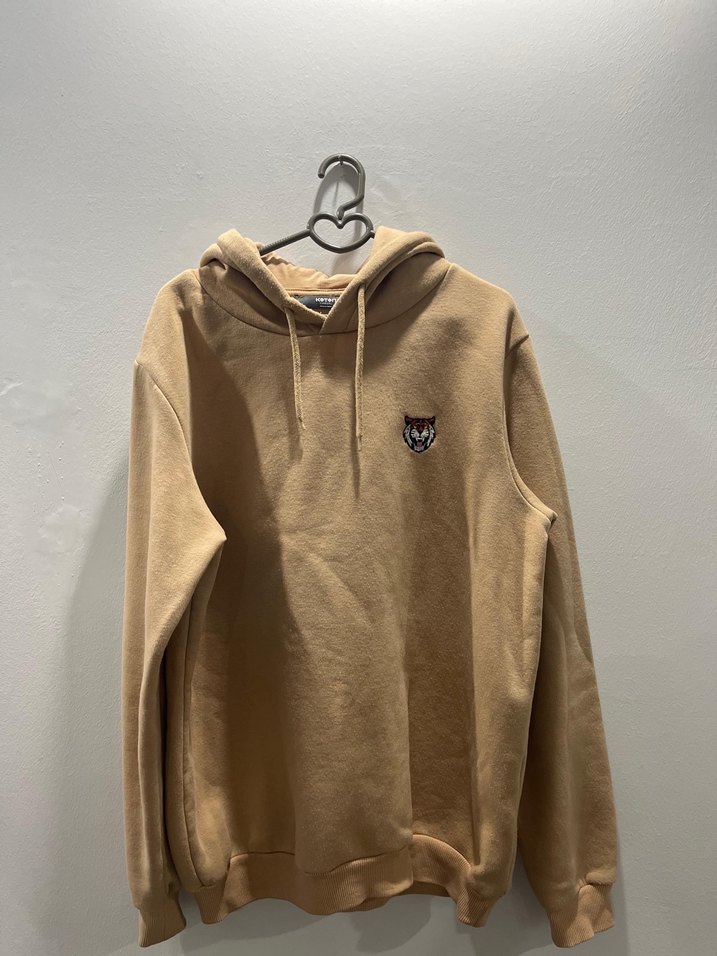 Yumuşak kumaştan, uzun kollu ve bol kesim bej kapüşonlu sweatshirt. Göğüste küçük işlemeli logo bulunur, rahat ve günlük kullanım için uygundur.