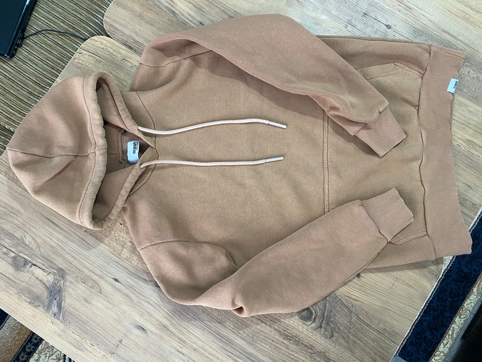 Yumuşak fleece kumaştan, uzun kollu ve bol kesim bej kapüşonlu sweatshirt. Rahat ve şık sokak stili için uygun, günlük kullanım için ideal.