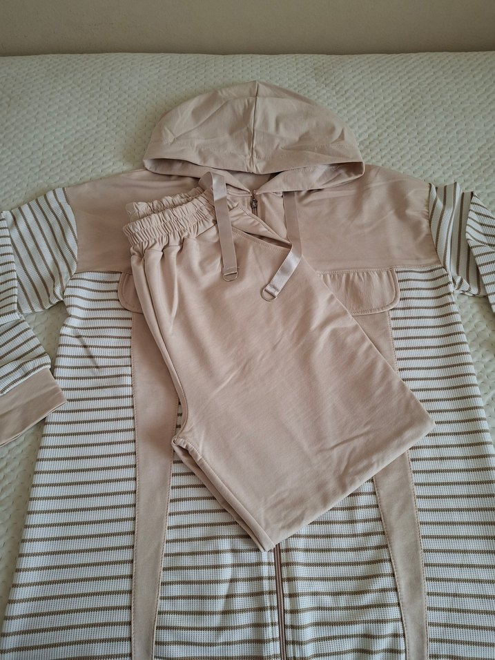 Bej renkli, kapüşonlu üst ve lastikli bel pantolonlu, rahat kesim takım. Kol ve ceplerde ince çizgiler bulunur. hiç giyilmedi yenidir