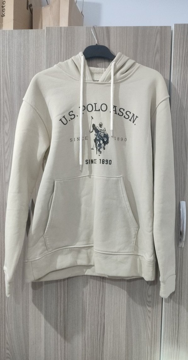 Bej renkte, uzun kollu ve kapüşonlu U.S. Polo Assn. sweatshirt. Rahat kesimli, baskılı logo ve ön cepli, günlük kullanıma uygun şık bir parça.